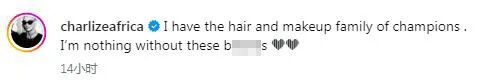 当地时间12月9日,好莱坞知名女星查理兹·塞隆(Charlize Theron)在个人社交媒体上发了几张漂漂亮亮的自拍照,配文“我拥有顶级的妆发团队。没有他们,我什么都不是”。